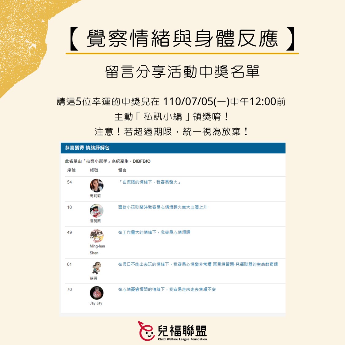 請這5位幸運的中獎兒在 110/07/05(一)中午12:00前 主動「私訊小編」領獎唷!