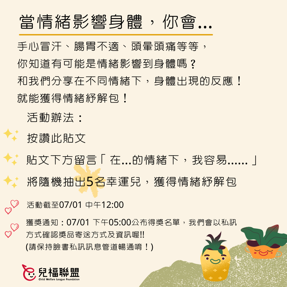 獲獎通知:07/01 下午05:00公布得獎名單,我們會以私訊方式確認獎品寄送方式及資訊喔!!(請保持臉書私訊訊息管道暢通唷!)