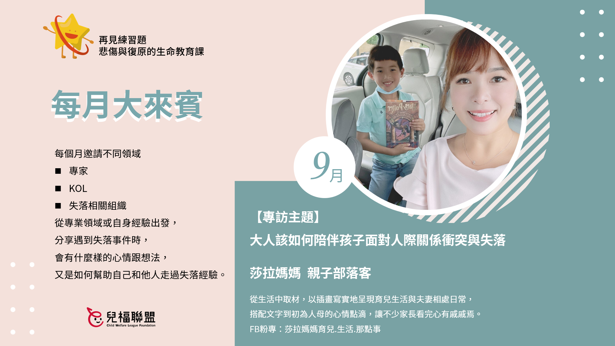 在生活中孩子會遇到許多的失落事件,像是霸凌、人際困擾、課業壓力及考試挫折、父母衝突或離婚、疾病帶來身心與生活上的改變、寵物/親人過世等等。 面對這些失落事件,有時候孩子不知道該怎麼處理,大人也不了解如何支持與陪伴孩子走過失落的低潮。 因此,每個月我們邀請不同領域的專家、KOL、失落相關組織,從專業領域或自身經驗出發, 分享遇到失落事件時,會有什麼樣的心情跟想法,又是如何幫助自己和他人走過生活中的失落經驗。