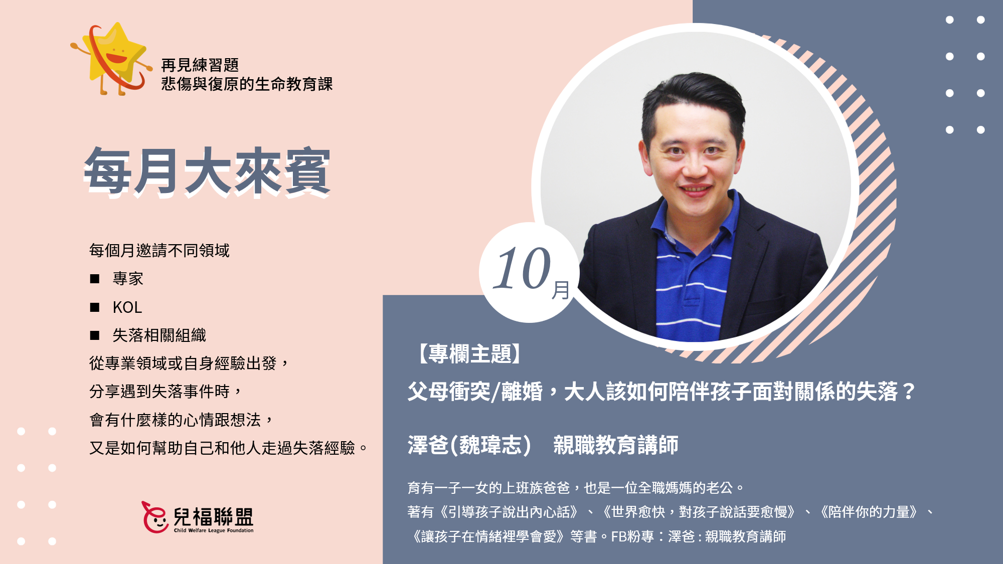 在生活中孩子會遇到許多的失落事件,像是霸凌、人際困擾、課業壓力及考試挫折、父母衝突或離婚、疾病帶來身心與生活上的改變、寵物/親人過世等等。 面對這些失落事件,有時候孩子不知道該怎麼處理,大人也不了解如何支持與陪伴孩子走過失落的低潮。 因此,每個月我們邀請不同領域的專家、KOL、失落相關組織,從專業領域或自身經驗出發, 分享遇到失落事件時,會有什麼樣的心情跟想法,又是如何幫助自己和他人走過生活中的失落經驗。