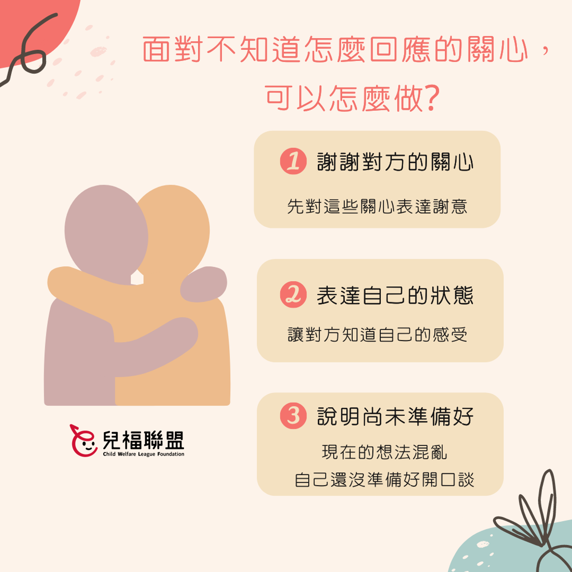 - 說明尚未準備好:最後也讓對方知道「不好意思,我現在還沒準備好,所以還沒辦法好好回應你的問題和關心。」每個人都有自己復原的速度和路程,我們不用勉強自己要跟別人一樣。