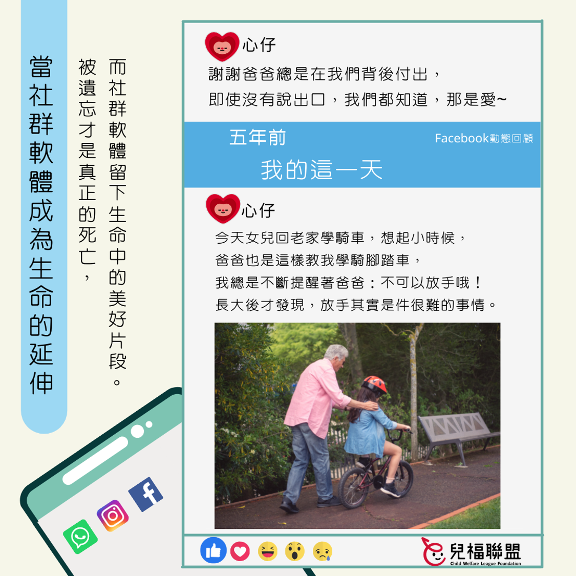在現代社會幾乎人人都有一個Facebook帳號,我們從社群軟體上得知他人的近況,貼文記錄著生活中重要的時刻。在親人過世後,除了本人要求必須刪除外,大多的社群帳號都會保留下來,成為我們想念親人的重要管道。Facebook也順應推出「動態回顧」的功能,我們會在一年中的某一日,收到過往貼文回顧的提醒,讓我們恍然想起記憶中,多年前的今日和親友一起度過的美好時光。