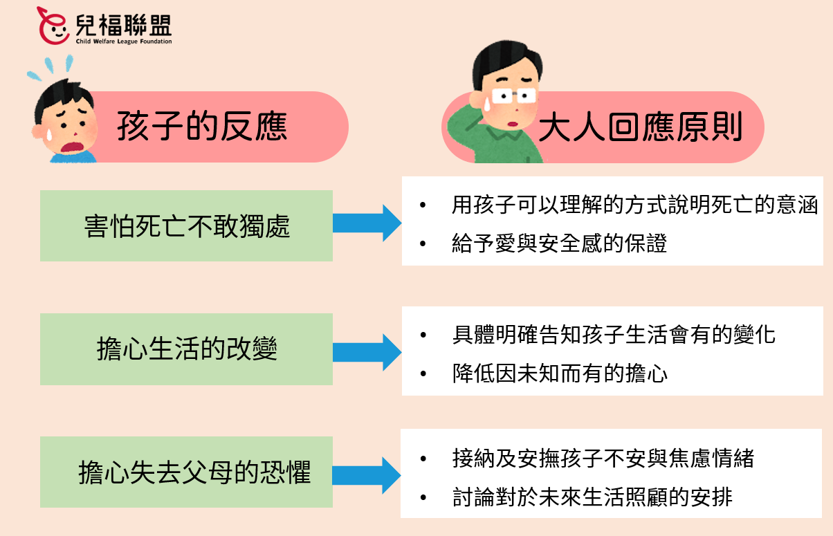 當孩子恐懼爸爸/媽媽也會跟著過世,大人可以回應: