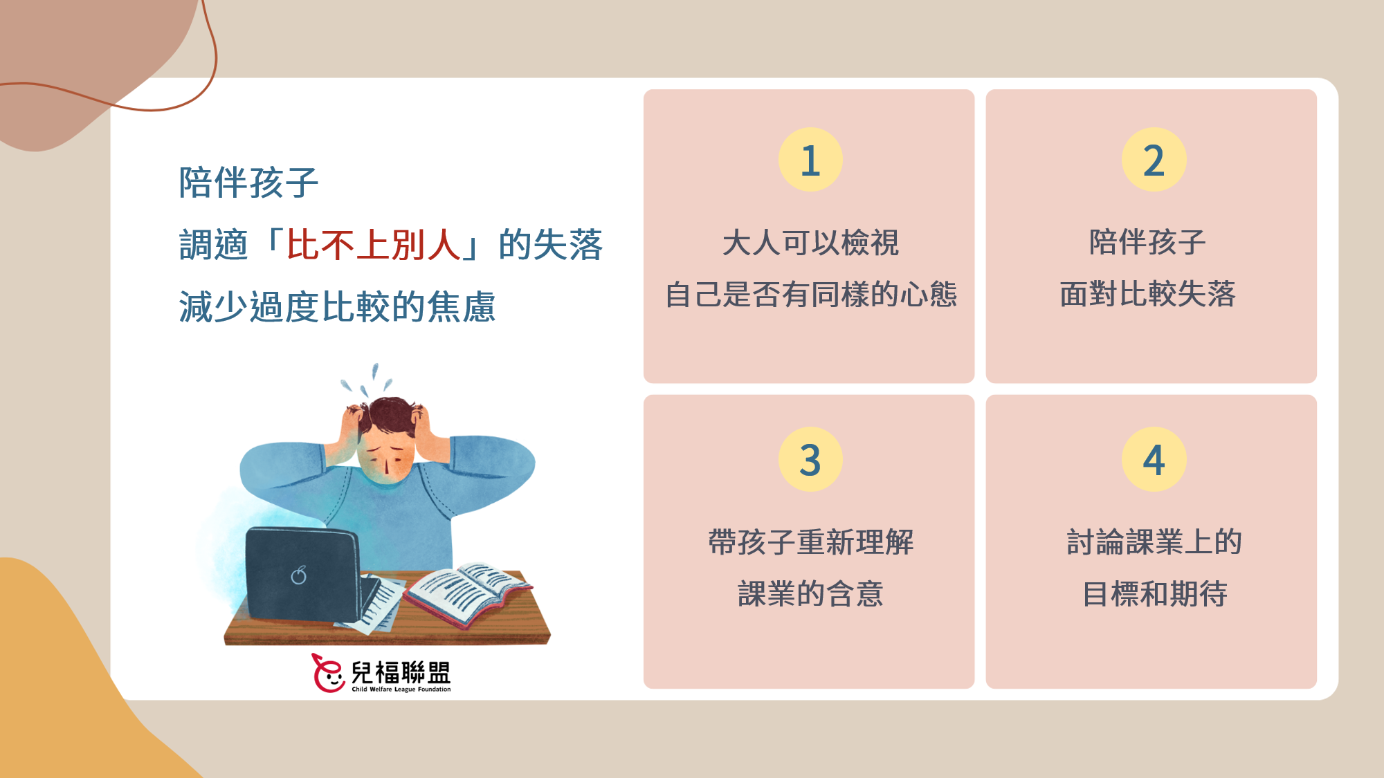 在比較的過程中,孩子發現自己沒有辦法跟上別人的步伐,無論怎麼努力還是達不到自己和爸媽的期待,這時孩子可能會覺得很難過,好像付出的時間都沒有得到回報;也可能會覺得自責,為什麼自己不能表現更好一點,這些都是正常的情緒表現,也是孩子正在被困擾的事情。因此大人可以陪伴孩子面對這些情緒,同理孩子的感受,傾聽孩子的想法,也陪伴孩子穩定情緒,放輕鬆後才能與孩子討論下一步可以怎麼做。