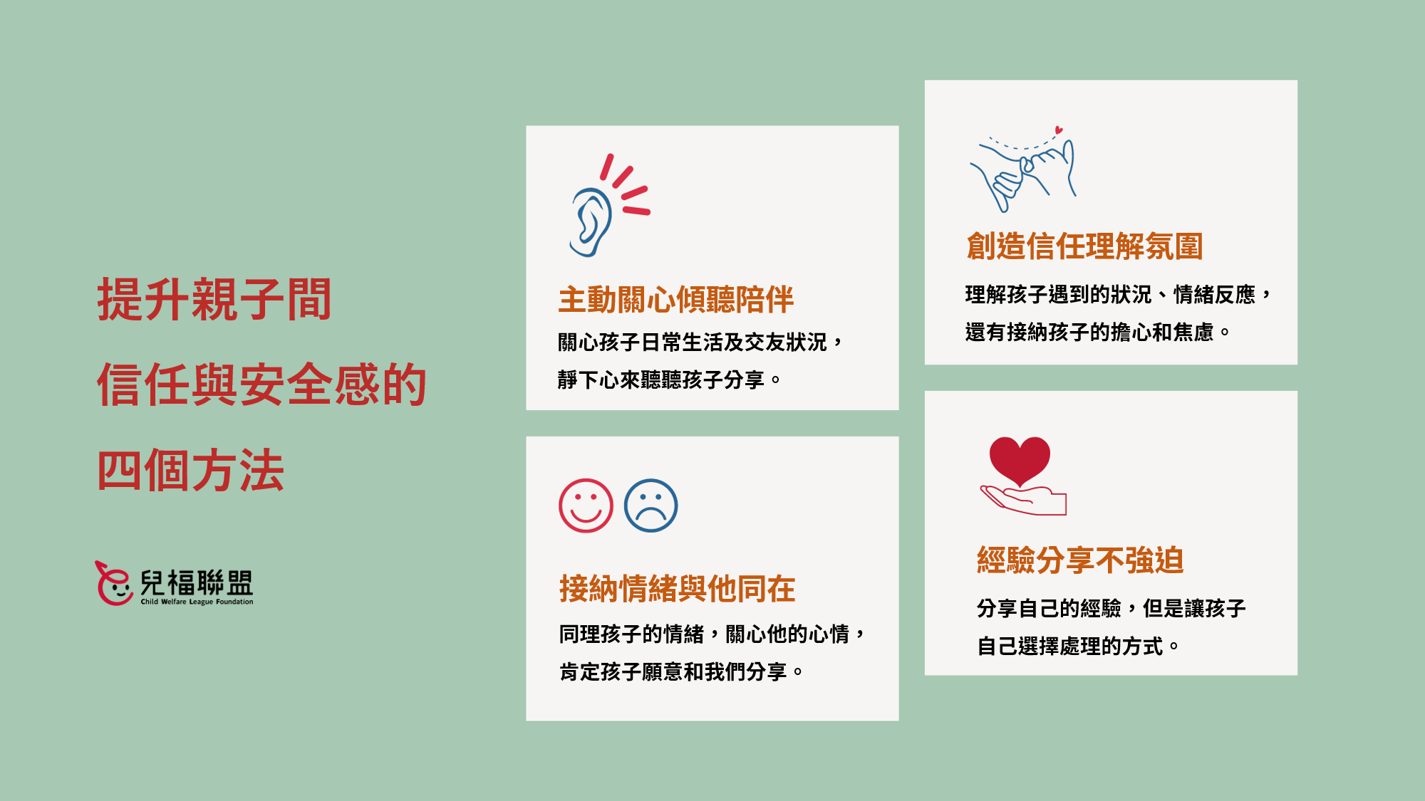 3) 創造信任理解氛圍:其實孩子最在意的是父母對自己的看法,希望自己在父母面前的表現是很棒的,所以當知道父母對於哪些的話題會有負面的情緒或反應,則會讓孩子退縮,不願意再多說,所以當我們能夠展現對於孩子遇到的狀況、會有的情緒反應以及擔心都能夠理解時,也能夠降低孩子對於跟大人坦承心事的焦慮,提升親子間的信任感。