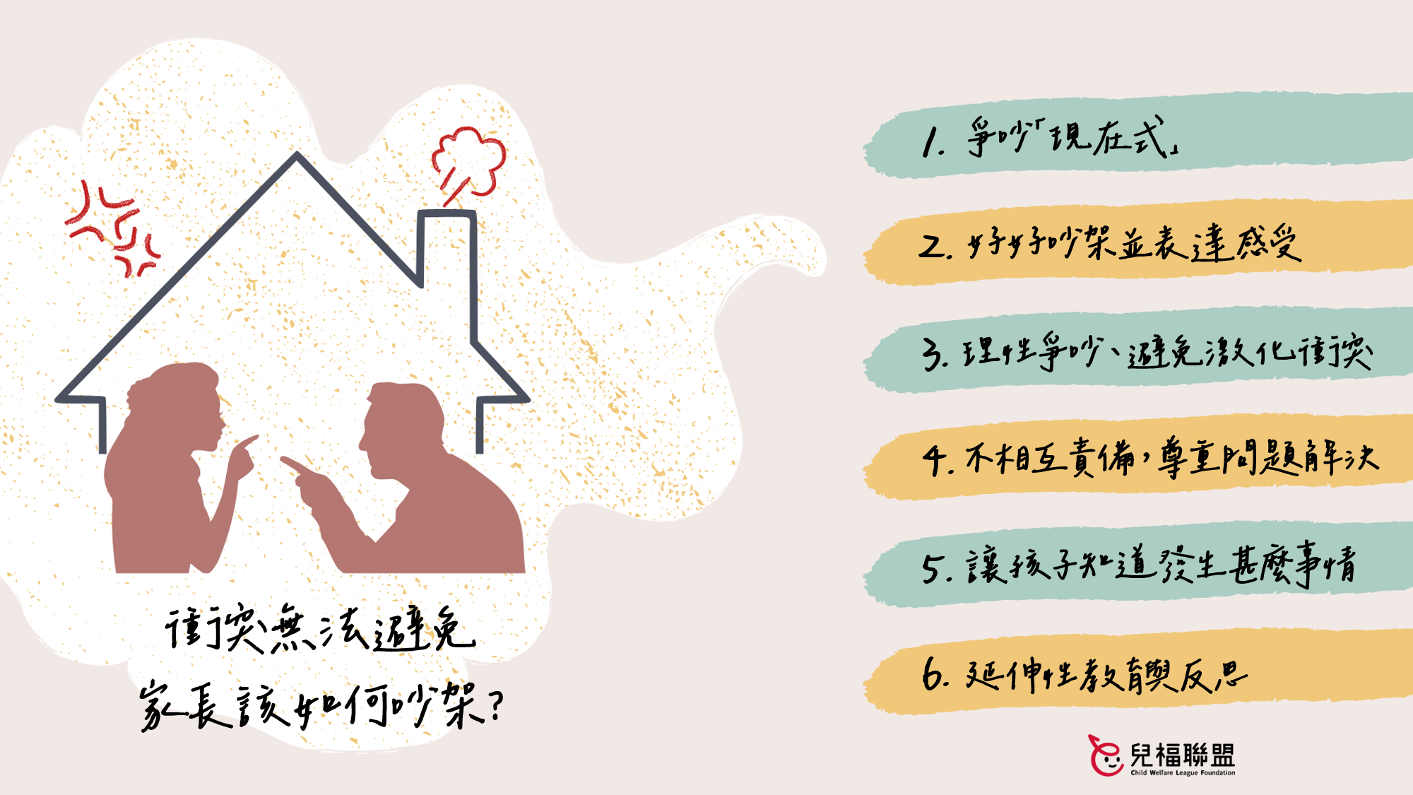 2) 好好吵架並表達感受:父母雙方都各執己見時,是無法進行交流的,與其攻擊對方「你有了解過我的感受嗎」、「你從不聽我說話、讓我說完」,建議可以試著表達自己當下情緒與想法「當我聽到你這樣說我的時候,我感到生氣跟難過」,也要試著打開耳朵聽聽對方的感受與想法,當雙方減少互相指責時,就有機會緩和衝突。