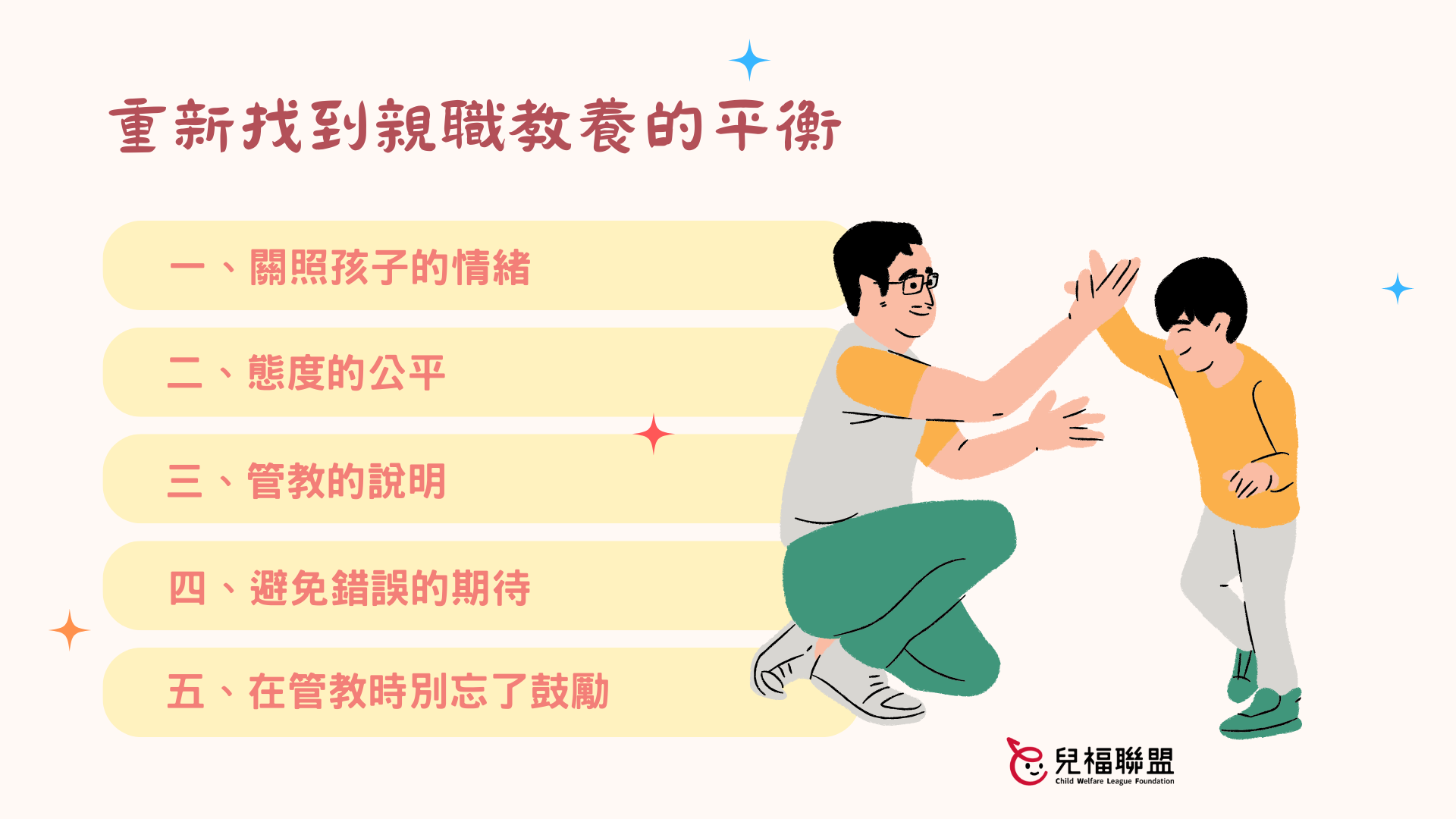 相信很多家長常常在管教孩子時總會感到疑惑、苦惱,不知道應該怎麼拿捏正確的尺度。當孩子對管教發出抗議的聲音,也是對於自己管教的提醒。好好檢視自己管教的方式是否需要調整?態度是否應該改變?多用上述的方法來幫助自己管教,讓親子關係的天平能維持更良性的平衡。
