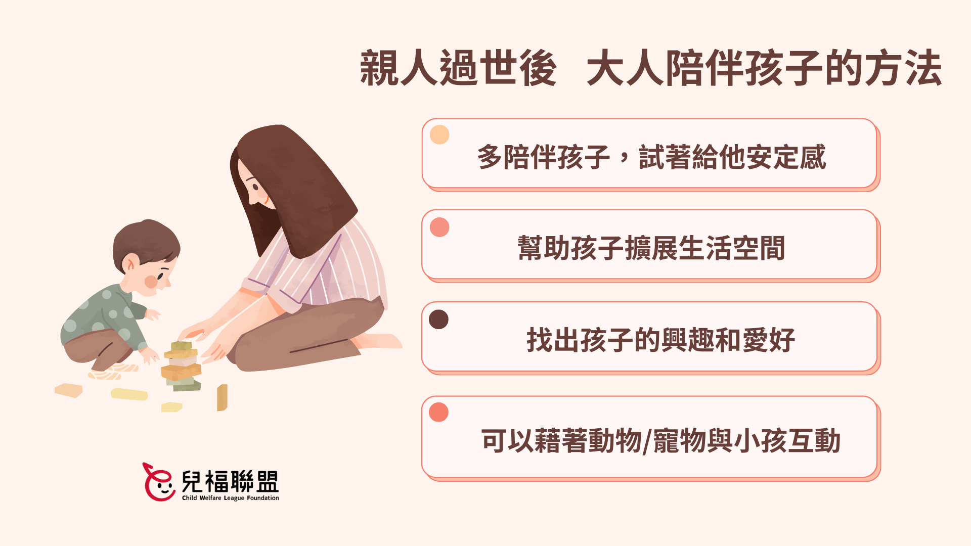 失去爸爸或媽媽後,孩子也是需要一些時間適應的,因此,儘管家長會擔心孩子跟人的互動狀況,但千萬不要因為孩子沒有好好的反應,就對他感到失望。在失去平日能夠依賴照顧者後,孩子心裡需要被保證以及獲得安全感的。所以,家長更應該要穩定的與孩子相處,最好可以將時間固定下來,並且儘量避免因工作或自己心情混亂而減少與孩子相處的時間;如此,頻繁的正向互動,才可以讓小孩心裡獲得安穩、快樂和滿足感。